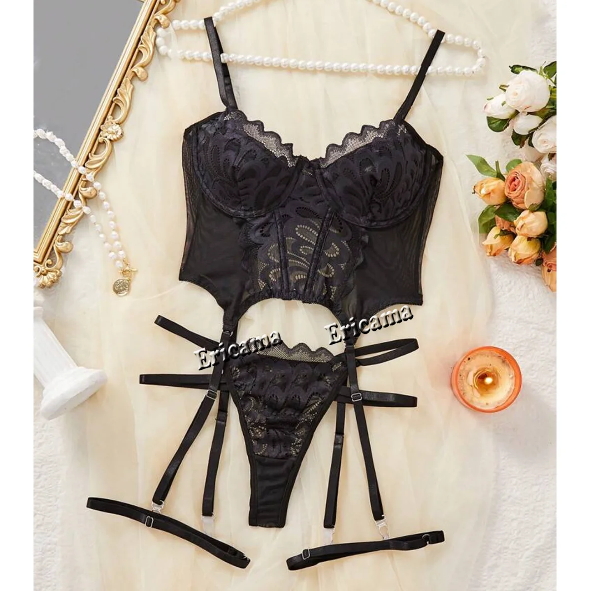 Seductive Lace Strappy Lingerie Set – Bra, Thong & Garter Belt